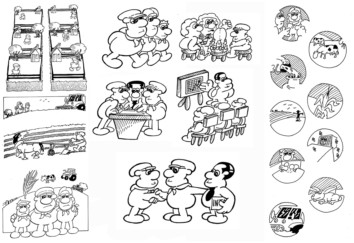 Lo siguiente tiene una historia particular. Veo el aviso publicado en un medio gráfico de Paraná. Advierto que estaban los globos de diálogo de cualquier viñeta pero carecia de personajes dibujados.Entonces me dirijo con el recorte del mismo al local y pido hablar con el dueño. Me presento y le pregunté si la idea que el tenía era tener un aviso dibujado como las publicidades de antaño. El entusiasmado me pregunta si además me animaba a hacer las caricaturas de los empleados. Asi que me pasó las fotos de todos ellos y dibujé el cuadrito para los diálogos. he aquí el desarrollo del mismo.